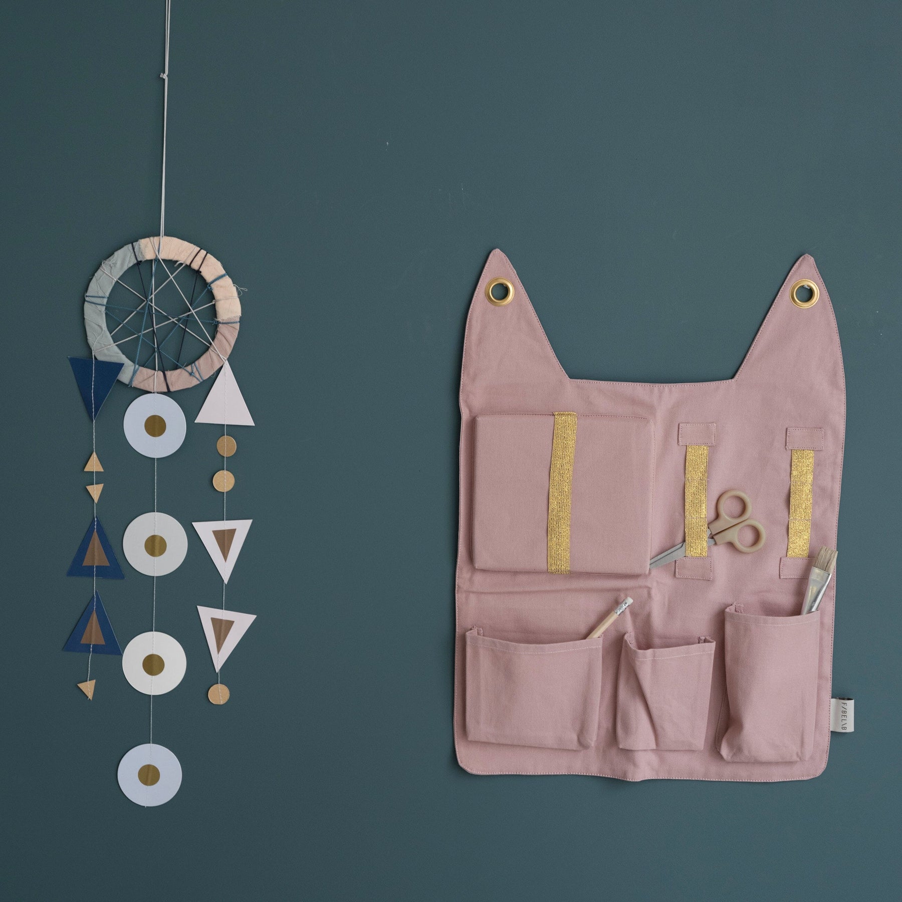 Little treasures and cards are made for tucking away into tiny hidden pockets. Crafted from durable organic cotton canvas, with a cork board to allow for pinning, this is a neat little addition to a desk or play space.